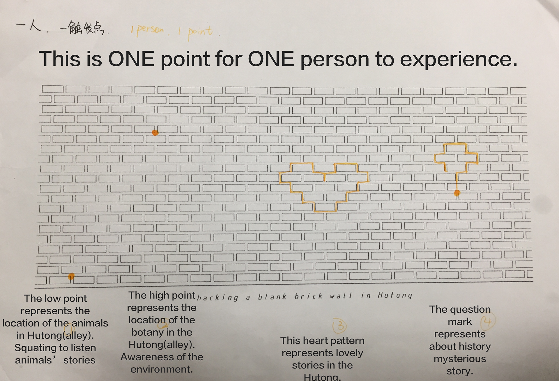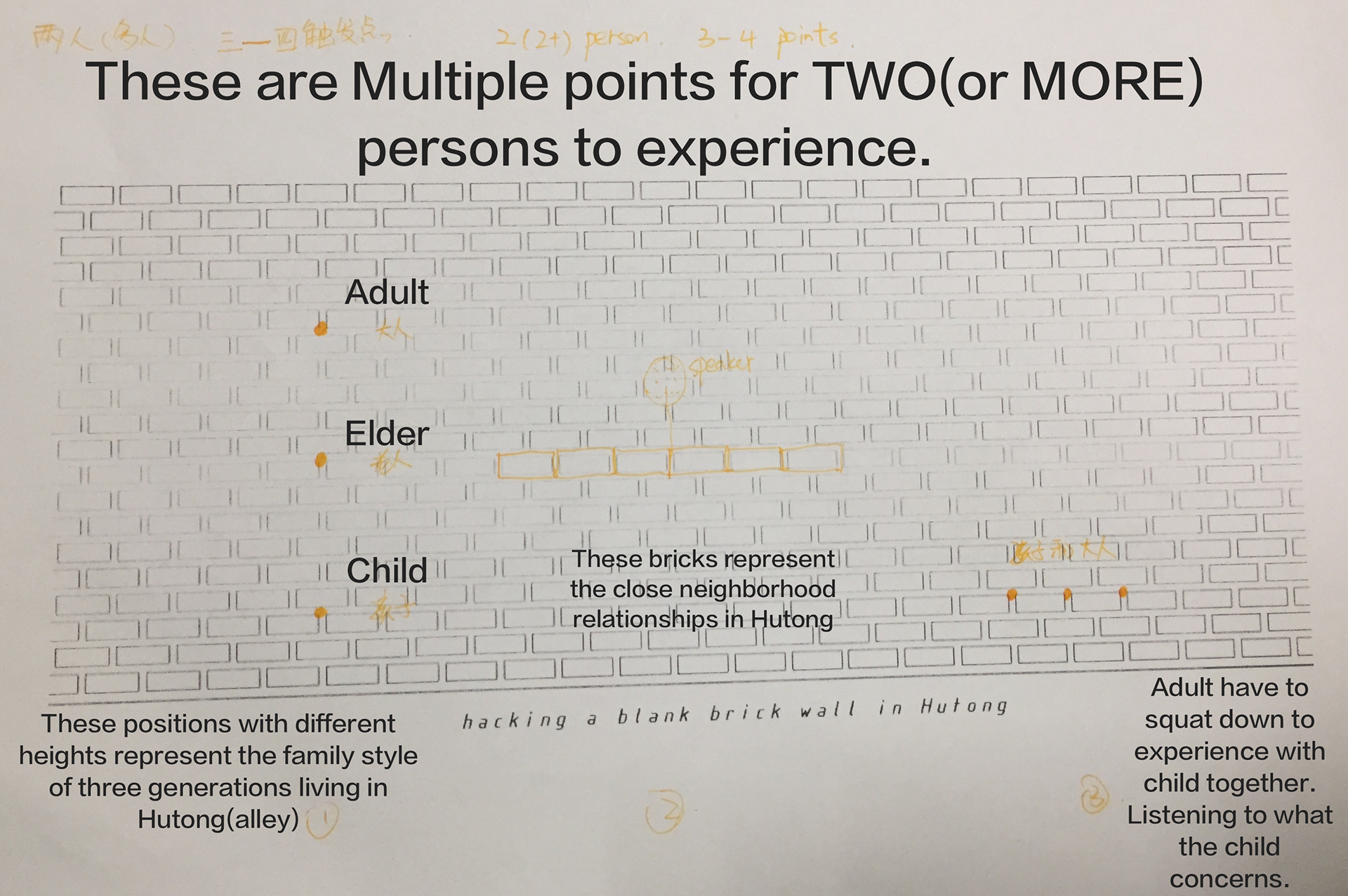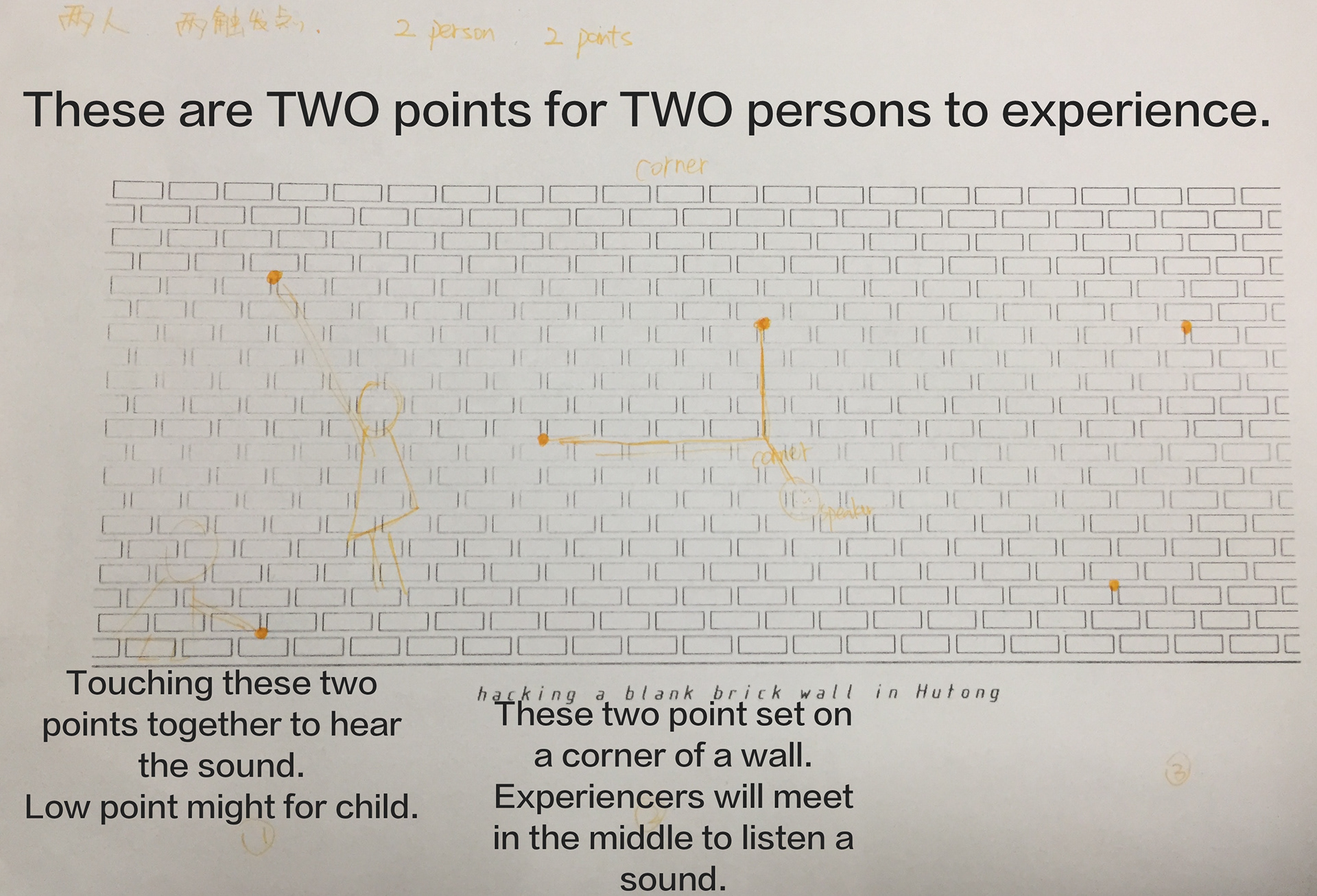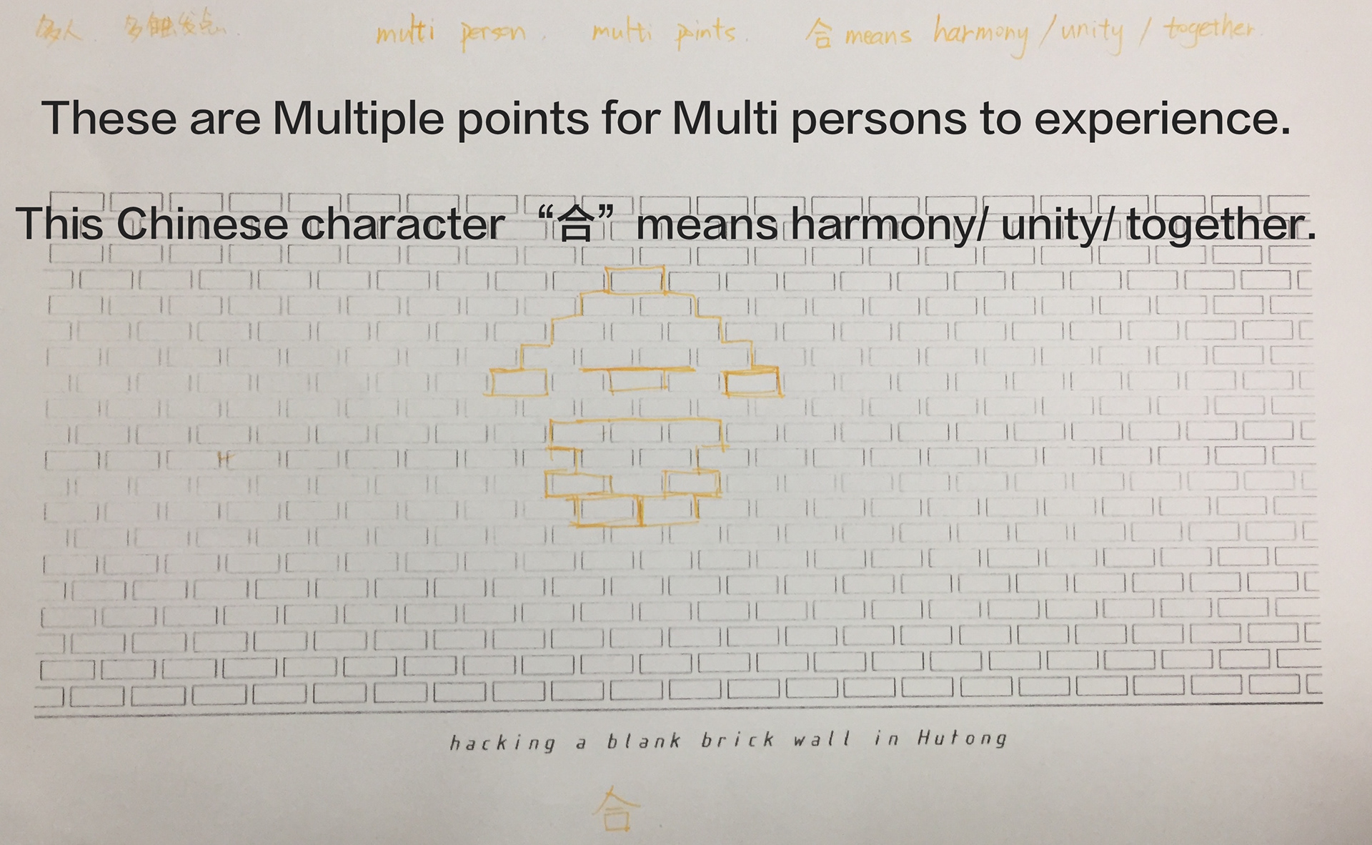 With a love for traditional hutong environment and an understanding of history of developing country, I would like to use the brick wall as a carrier, anthropomorphic it to express the changes in Chinese history, ancient and modern handed down living habits. Through the touch to feel the brick wall lines, listen to the brick wall to tell the story of Chinese history and alley. Letting people in the process of hearing the sound and feeling the touch have a reflection of the meaning of their actions.