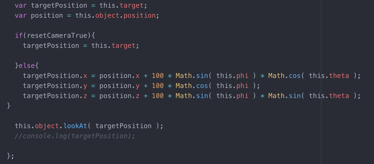 I was in charge of making the all the 3D animations by code, it a complicated process to deal with cameras and controllers settings, and I used Tween.js as well. A big challenge for me is to control both the user input with the key board and the view changes by mouse moving and keys press, also for the reset camera part. Because I am using the first person control function to control the view of our web evrionment, it has the conflict between the control object and the mouse's position. So I changed the library of it a little bit for my reset camera and mouse position's purpose. below is the changes: